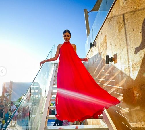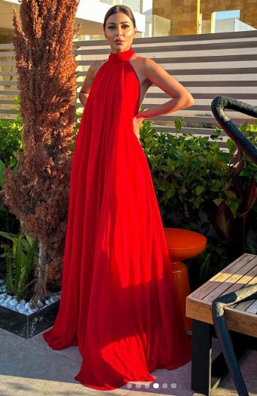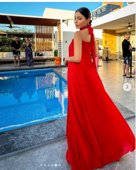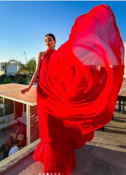 وبدت مهيرة عبدالعزيز بإطلالة ناعمة تشبه زهرة الحب في بستان الزهور، حيث ارتدت فستان طويل فضفاض، بلياقه عالية، صمم من قماش الحرير باللون الأحمر الصارخ.
