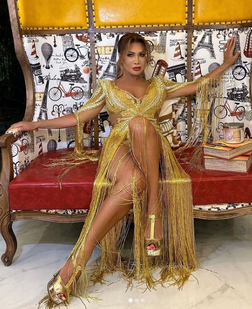 وتألقت نوال الزغبي بإطلالة ذهبية تبدو كالنجمة في السماء، حيث ارتدت فستان مجسم، قصير، بأكمام طويلة، مطرز بالكامل المزين بالشراشيب، الفستان حمل توقيع لابورجوازي، فيما انتعلت صندلًا بكعب عال بنفس اللون.