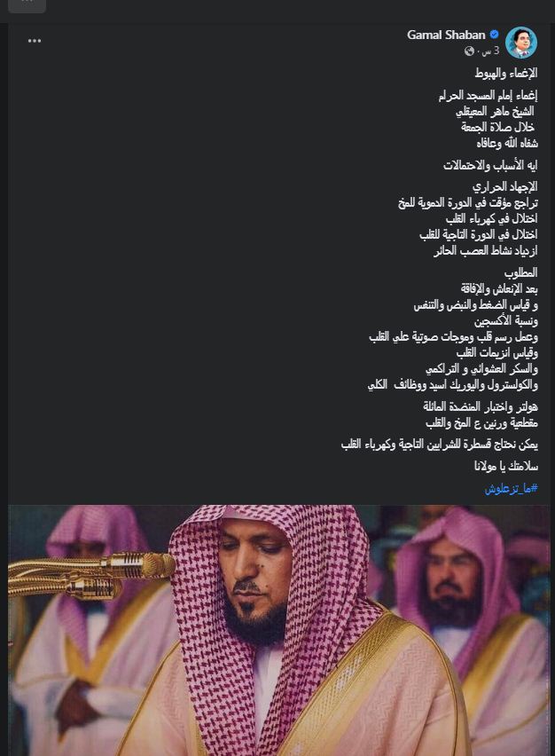 وقال شعبان:" لإغماء والهبوط.. إغماء إمام المسجد الحرام الشيخ ماهر المعيقلي خلال صلاة الجمعة شفاه الله وعافاه.. ايه الأسباب والاحتمالات
