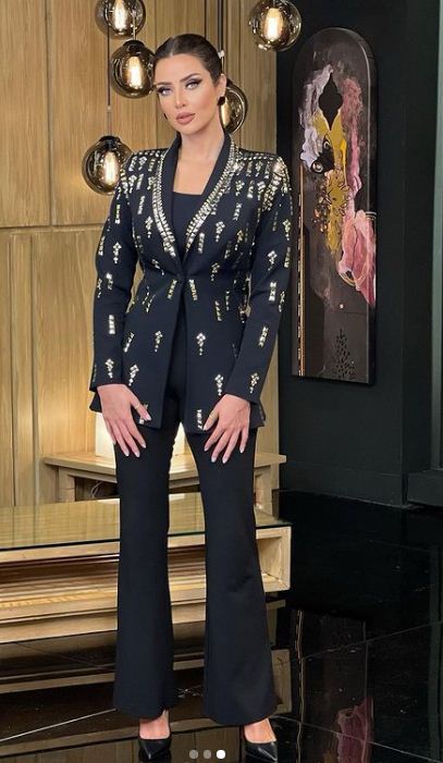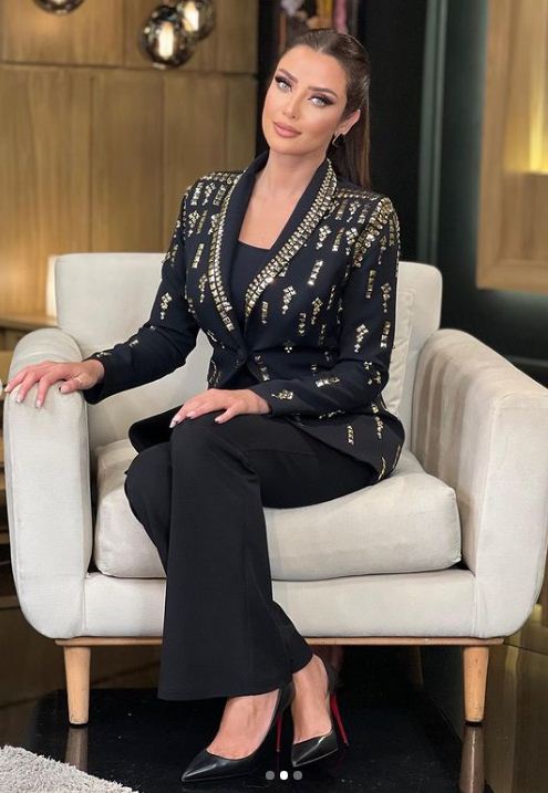 أما من الناحية الجمالية، اختارت تسريحة شعر مميزة تتناغم مع إطلالتها الأنيقة، ووضعت مكياجًا صاخبًا مرتكزًا على الألوان الترابية مع تحديد عينيها بالكحل والماسكرا السوداء ولون النود في الشفاه.