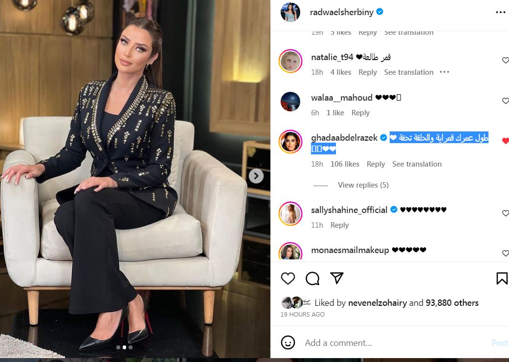 وحرصت النجمة غادة عبدالرازق على إبداء رأيها بحسن إطلالة رضوى الشربني وهذا ما اكدته تعليقها، قائلة: " طول عمرك قمراية والحلقة تحفة".