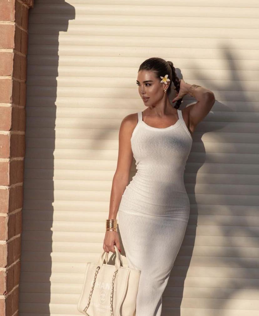 أطلت ياسمين صبري مثل الفراشة البيضاء وسط أشعة الشمس الذهبية والطبيعة الخلابة، بلوك ناعم وجذاب، حيث كانت ترتدي فستانًا صيفيًا مثير ومجسم باللون الأبيض، طويل ومكشوف الأكمام ويبرز منحنيات جسدها، فيما انتعلت حذاء أنيق بنفس اللون وحملت حقيبة متوسطة الحجم تناغمت مع إطلالتها، مما أبرز أنوثتها الطاغية وقوامها الرشيق الممشوق.
