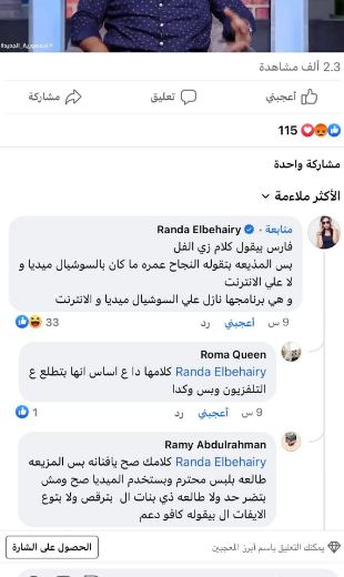 من جابنها علقت الفنانة راندا البحيري، على فيديو حلقة الشاعر فارس قطرية المنشور عبر صفحة البرنامج، قائلة: "فارس بيقول كلام زي الفل، لكن المذيعة بتقول أن النجاح عمره ما كان على السوشيال ميديا ولا الإنترنت، وهي برنامجها نازل على السوشيال ميديا والإنترنت"، لتأتي تعليقات متابعي البرنامج في صالح المذيعة قائلة أحدهم: "المذيعة طالعة لابسة لبس محترم وبتستخدم الميديا صح ومش بتضر حد خالص، ولا طالعة زي البنات اللي بترقص ولا اللي بيعملوا لايفات هايفة".