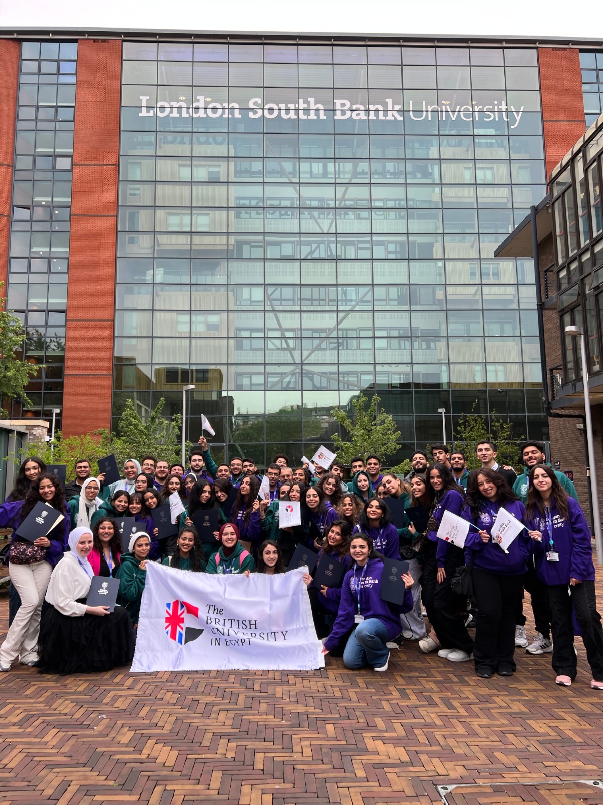 وأوفدت الجامعة البريطانية في مصر 60 طالبًا من كليات الجامعة المختلفة، إلى جامعة لندن ساوث بانك (LSBU)، الشريك البريطاني للجامعة، في إطار الشراكة الممتدة والفعالة بين الجامعة البريطانية في مصر وجامعة لندن ساوث بانك بالمملكة المتحدة، والتي تمنح خريجي الجامعة البريطانية شهادات معتمدة منها بالإضافة إلى الشهادة التي يحصلون عليها من المجلس الأعلى للجامعات المصرية، ويتضمن البرنامج نشاطات تعليمية وثقافية وترفيهية، مما يتيح للطلاب فرصة لإثراء خبراتهم التعليمية وتنمية مهاراتهم، وهو ما يشكل فرصة جيدة للاستفادة من الفرص المتاحة بالجامعة الشريكة.