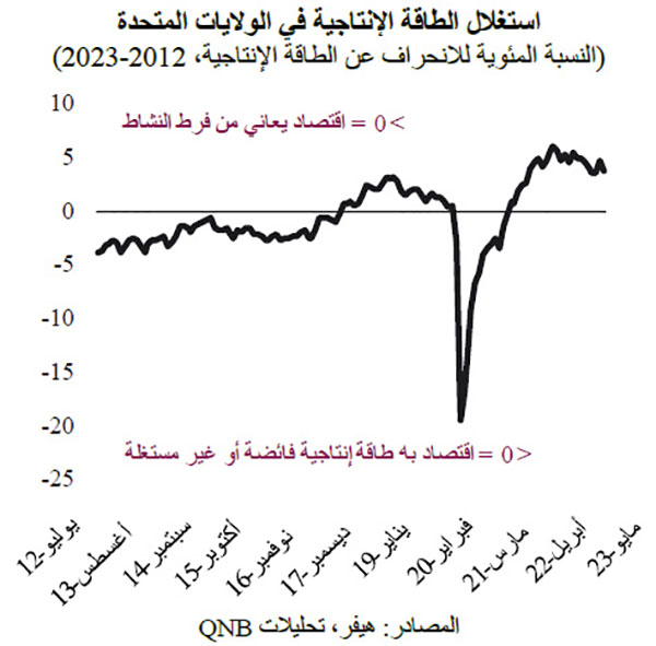 يشير معدل استخدام الطاقة الإنتاجية فى الولايات المتحدة، الذى يتم قياسه مع الأخذ فى الاعتبار حالة سوق العمل بالإضافة إلى تراخى القطاع الصناعي، إلى أن قيود الطاقة الإنتاجية لا تزال قائمة. بمعنى آخر، يوجد حالياً طلب أعلى على العمالة مقارنة بعدد العاملين المتاحين، فى حين أن النشاط الصناعى يتجاوز اتجاهه طويل الأجل. قد تؤدى هذه الظروف إلى زيادات سريعة فى الأسعار فى حالة تعافى أسعار السلع أو تسارع الاستهلاك المحلي. ومن غير المرجح أن يخفض بنك الاحتياطى الفيدرالى أسعار الفائدة أو حتى يتوقف لفترة طويلة جداً عن رفعها إلى أن يتراجع سوق العمل بشكل أكبر وتزداد الطاقة الفائضة فى القطاع الصناعي، مما يوفر حاجزاً للاقتصاد لامتصاص الصدمات دون التعرض لمخاطر تسارع التضخم.