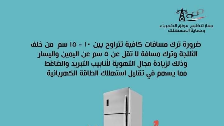 نصح جهاز تنظيم مرفق الكهرباء وحماية المستهلك عبر صفحته الرسمية على موقع التواصل الاجتماعي فيس بوك "هتفرق فى استهلاكك كتير"، ضرورة ترك مسافات كافية تتراوح بين 10 - 15 سم خلف الثلاجة أو الديب فريزر وترك مسافة لا تقل عن 5 سم عن اليمين واليسار، وذلك لزيادة مجال التهوية ، مما يسهم في تقليل استهلاك الطاقة الكهربائية.