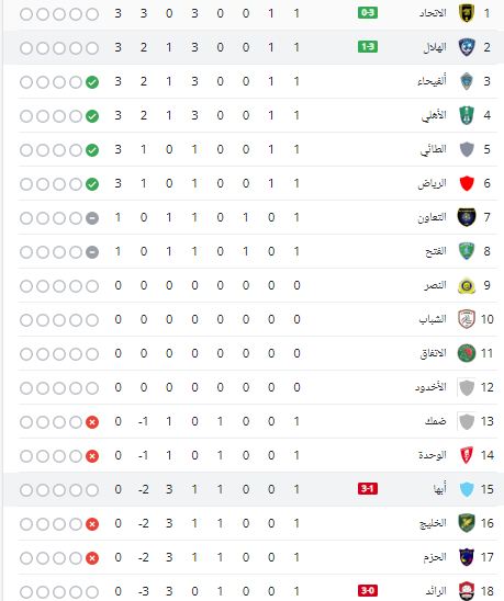 بهذه النتيجة يحتل الهلال وصافة ترتيب الدوري السعودي برصيد 3 نقاط، فيما يحل أبها في المركز الـ 15 دون رصيد من النقاط.