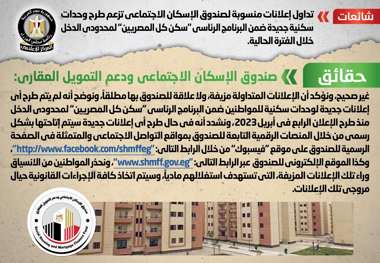 أعلن المركز الإعلامي لمجلس الوزراء، وصندوق الإسكان الاجتماعي ودعم التمويل العقاري، أنه لا صحة لطرح وحدات سكنية جديدة ضمن البرنامج الرئاسي "سكن كل المصريين" لمحدودي الدخل خلال الفترة الحالية، وأن الإعلانات المتداولة مزيفة، ولا علاقة للصندوق بها مطلقاً، مُوضحًا أنه لم يتم طرح أي إعلانات جديدة لوحدات سكنية للمواطنين ضمن البرنامج الرئاسي "سكن كل المصريين" لمحدودي الدخل منذ طرح الإعلان الرابع في أبريل 2023، مشدداً أنه في حال طرح أي إعلانات جديدة سيتم إتاحتها بشكل رسمي من خلال المنصات الرقمية التابعة للصندوق بمواقع التواصل الاجتماعي والمتمثلة في الصفحة الرسمية للصندوق على موقع "فيسبوك" من خلال الرابط التالي: "http://www.facebook.com/shmffeg"، وكذا الموقع الإلكتروني للصندوق عبر الرابط التالي: "www.shmff.gov.eg"، محذراً المواطنين من الانسياق وراء تلك الإعلانات المزيفة، التي تستهدف استغلالهم مادياً، وسيتم اتخاذ كافة الإجراءات القانونية حيال مروجي تلك الإعلانات.