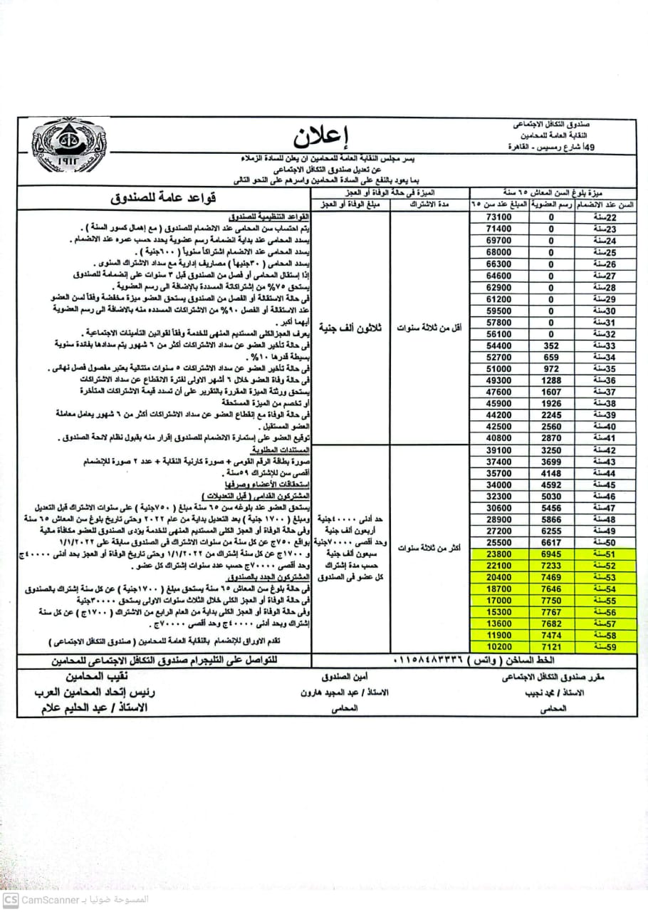 وافق عبدالحليم علام نقيب المحامين رئيس اتحاد المحامين العرب على زيادة قيمة مساهمة صندوق التكافل للمشتركين فيه، وذلك بعد الدراسة الاكتوارية، والتي أفادت بالآتي: