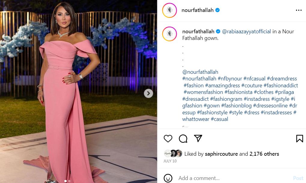 واشارت ان يحدث حوار يجمع بينها وبين النجمة التي تريد ان ترتدي فستان من توقيعها لتعرف طبيعة المناسبة التي تحضر إليها وتختار التصميم المتناغم مع قوامها والقصة التي تتماشى مع شخصيتها لتطل النجمة بمظهر أنيق ساحر، وهذا ما فعلته مع النجمة نوال الزغبي وكارول سماحة ودنيا سمير غانم وياسمين رئيس والإعلامية رابعة الزيات وغيرهن من النجمات والإعلاميات الشهيرات.