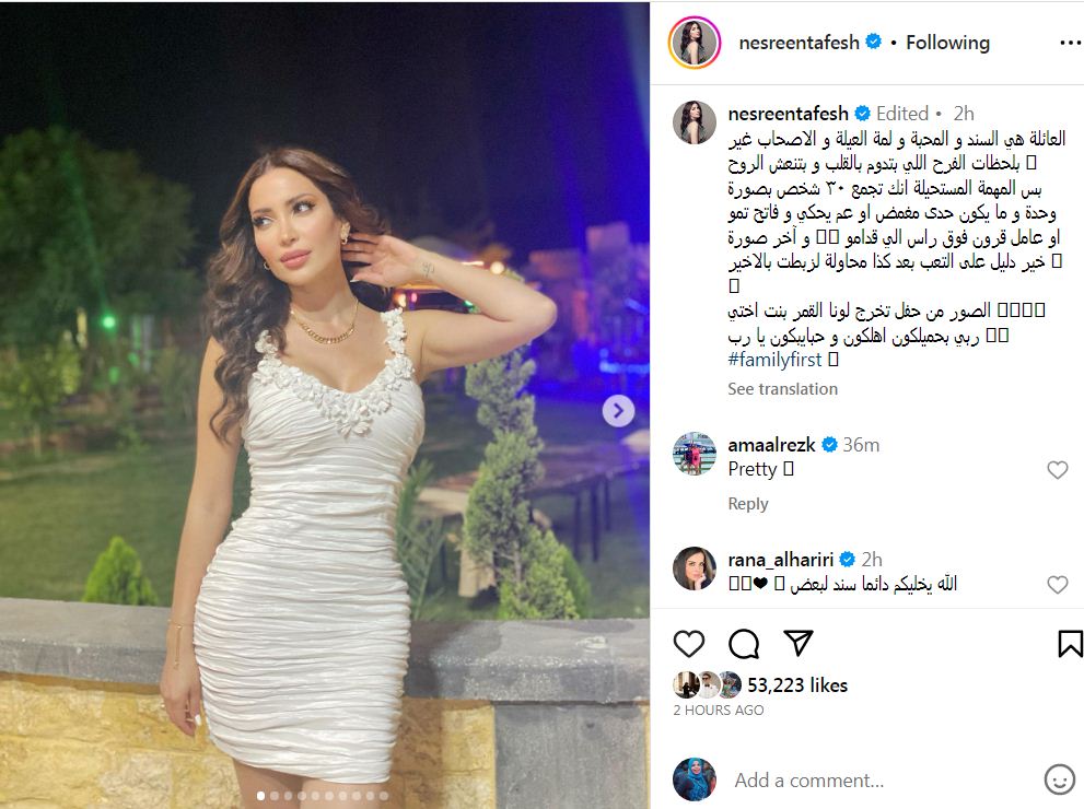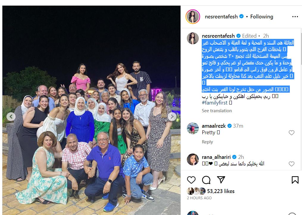 وعلقت على الصور، قائلة: " العائلة هي السند و المحبة و لمة العيلة و الاصحاب غير بلحظات الفرح اللي بتدوم بالقلب و بتنعش الروح ".