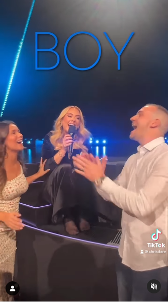 وقالت الزوجة لورد، إنها احتفظت بالورقة التي تحمل جنس جنينها في ظرف مختوم منذ الأسبوع الـ12، وبالفعل، قامت أديل باستدعاء الزوجين إلى مقدمة المسرح، وجلست على حافة المسرح، وفتحت الظرف لتقرأ بصوت عالٍ جنس المولود بداخله، لتقول: " شانتيل وكريس سينجبان ولد ".