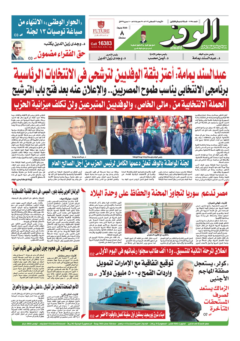 تنشر جريدة الوفد في عددها الصادر، غدًا الأربعاء، العديد من الموضوعات والتقارير الإخبارية المهمة، أبرزها: "عبدالسند يمامة: أعتز بثقة الوفديين لترشحي في الانتخابات الرئاسية".