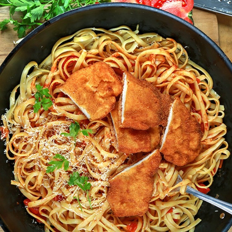 4. طريقة التقديم: يُسخّن زيت القلي في مقلاة، ثمّ تُقلى صدور الدجاج حتى تصبح ذهبيّة اللون، وتُقدّم مع الـ"باستا.