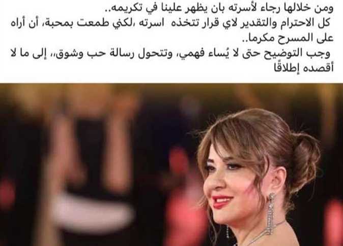 وأوضحت: «كل الاحترام والتقدير لأي قرار تتخذه أسرته، لكني طمعت بمحبة، أن أراه على المسرح مكرمًا وجب التوضيح حتى لا يُساء فهمي، وتتحول رسالة حب وشوق إلى ما لا أقصده إطلاقًا»