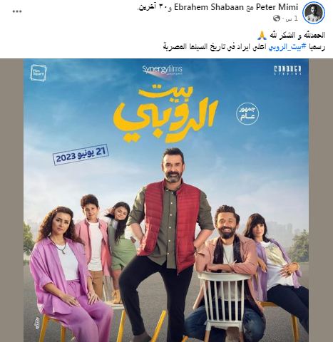 وكتب بيتر ميمي: “الحمد لله والشكر لله، رسميا فيلم بيت الروبي أعلى إيراد في تاريخ السينما المصرية”، وإنهالت عليه التعليقات من قبل الجمهور الذي حرص على تقديم التهنئة والمباركات بعد النجاح العظيم الذي ناله الفيلم .