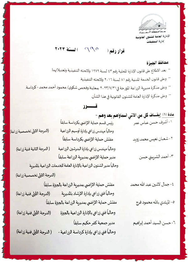 وجاء نص القرار الذى أصدره اللواء أحمد راشد محافظ الجيزة، بعد الاطلاع على قانون الإدارة المحلية رقم 43 لسنة 1979 ولائحته التنفيذية وتعديلاتهما، وقانون الخدمة المدنية رقم 81 لسنة 2016، وقانون مديرية الزراعة المؤرخة فى 31 /7/ 2023، بمعاينة وفحص شكوى م.أ، وعلى مذكرة الإدارة المحلية للشئون القانونية فى هذا الشأن قرار إيقاف كل من (أ- ح-ع) رئيس قسم حماية الأراضى بكرادسة سابقًا ويعمل حاليًّا مهندس زراعى بإدارة أوسيم الزراعية، و(ش-ن-م) مفتش حماية الأراضى بكرادسة سابقًا ويعمل حاليًّا مهندسًا زراعيًّا بإدارة البدرشين الزراعية، (أ-ش-ح) مدير حماية الأراضى بمديرية الزراعة سابقًا ويعمل حاليًّا مدير الشئون الزراعية بالإدارة العامة للخدمات الزراعية بالمديرية، (ج-ل-ع) مفتش حماية الأراضى بمديرية الزراعة بالجيزة سابقًا ويعمل حاليًّا فنيًّا زراعيًّا بإدارة الإرشاد بالمديرية، (أ-ب-م) مفتش حماية الأراضى بمديرية الزراعة بالجيزة سابقًا ويعمل حاليًّا فنيًّا زراعيًّا بالإدارة الزراعية بالجيزة، (ح-س-أ) مدير جمعية كفر حكيم سابقًا وحاليًّا فنيًّا زراعيًّا بإدارة كرداسة الزراعية، وذلك لأنهم قاموا بإدخال التدليس وإعداد بيانات وتحرير شهادات ومحاضر معاينة على غير الحقيقة؛ لتضليل اللجنة العليا لحماية الأراضى الزراعية بشأن قطعة الأرض الكائنة بناحية حوض سيدى عيسى بكفر حكيم بكرداسة.