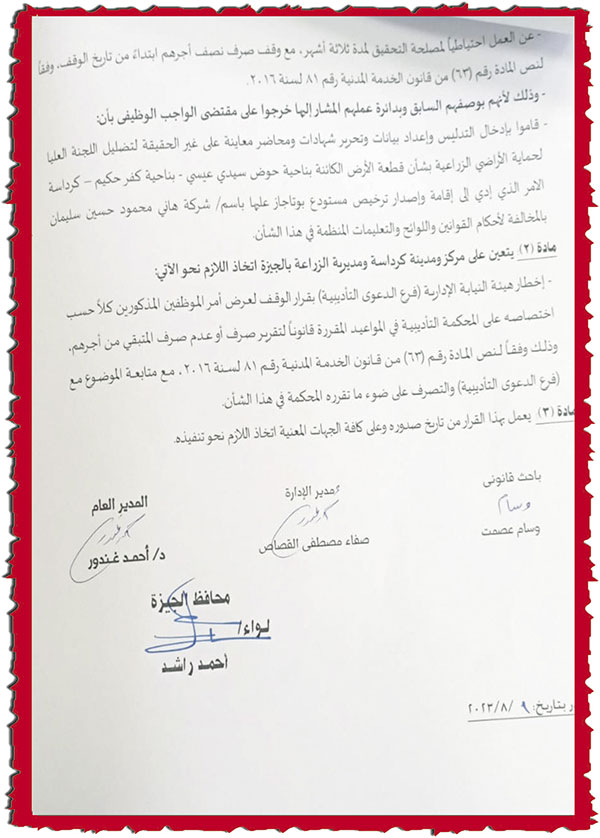 لم يكتف محافظ الجيزة بهذا فقط من أجل حماية الأراضى الزراعية وتجفيف منابع الفساد، لكنه أصدر قرارًا رقم 995 لسنة 2023، ينص على إيقاف 5 موظفين بالإدارة الزراعية بنطاق مركز ومدينة كرداسة لمدة 3 أشهر مع وقف نصف أجرهم وفقًا لنص القانون.