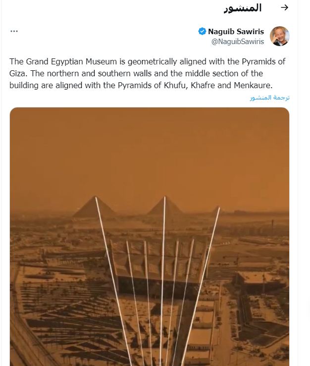 وغرد ساويرس: " يتماشى المتحف المصري الكبير هندسيًا مع أهرامات الجيزة، تتماشى الجدران الشمالية والجنوبية والجزء الأوسط من المبنى مع أهرامات خوفو وخفرع ومنقرع".