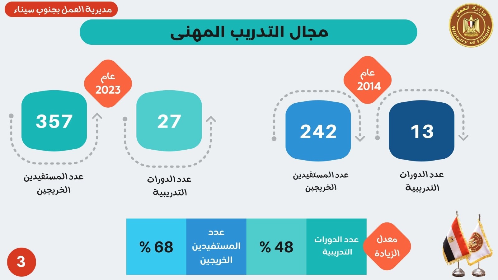 وجاء في "الإنفوجراف" أنه في مجال التدريب المهني، بلغ عدد الدورات التدريبية المجانية المقدمة للشباب حتى عام 2014، 13 برنامج تدريبي استفاد منها 242 متدرباً ومتدربة، وفي عام 2023 بلغ عدد الدورات التدريبية 27 دورة، استفاد منها 357 متدرب بزيادة قدرت بنسبة 68 %، كما انه في مجال شؤون المرأة وتكافؤ الفرص في عام 2014 لم تكون هناك أي برامج خاصة بهذا المجال، وفي عام 2023 بلغت عدد البرامج التدريبية المقدمة لأهالي سيناء 6 برامج استفاد منها 150 سيدة، وذلك في إطار التمكين الاقتصادي وفتح آفاق جديدة لتنمية المرأة السيناوية بالتعاون مع الوزرات والجهات المعنية، لإحياء دور المرأة في العمل والصناعة.