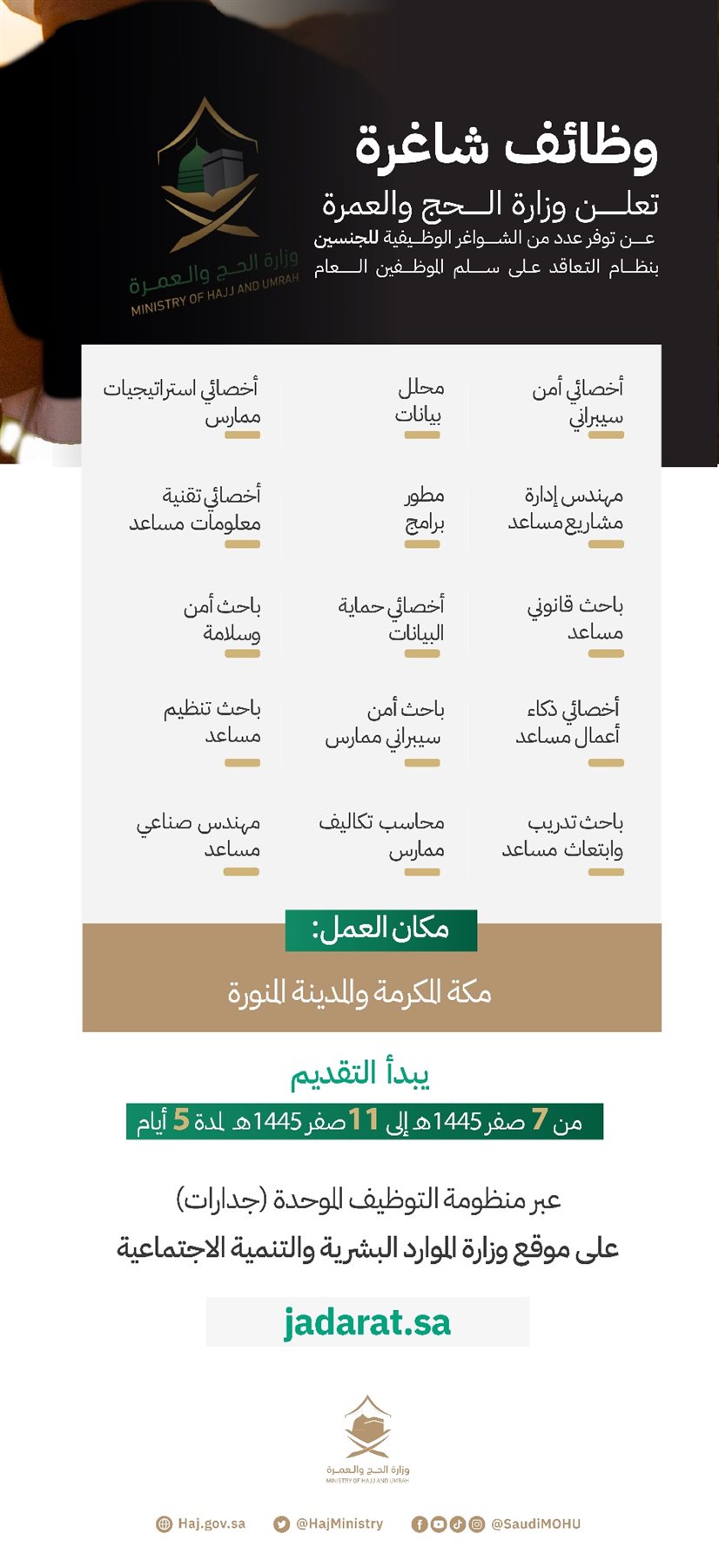وأعلنت وزارة الحج والعمرة أن التقديم على وظائفها السابقة يكون بشكل إلكتروني عبر منظومة التوظيف الموحدة (جدارات) على موقع وزارة الموارد البشرية والتنمية الاجتماعية.. jadarat.sa