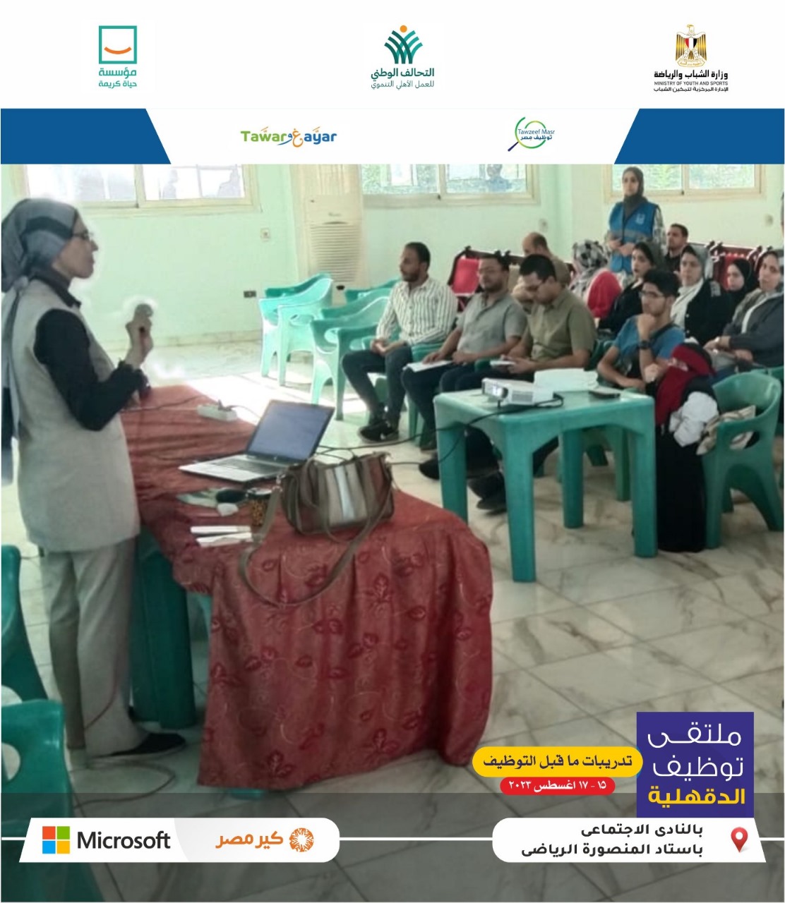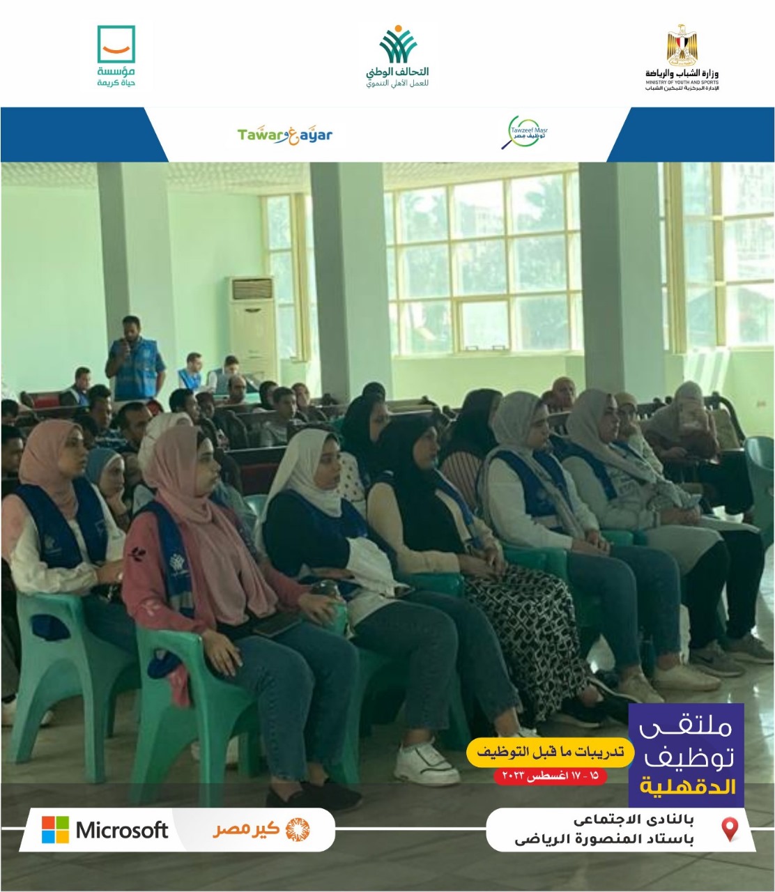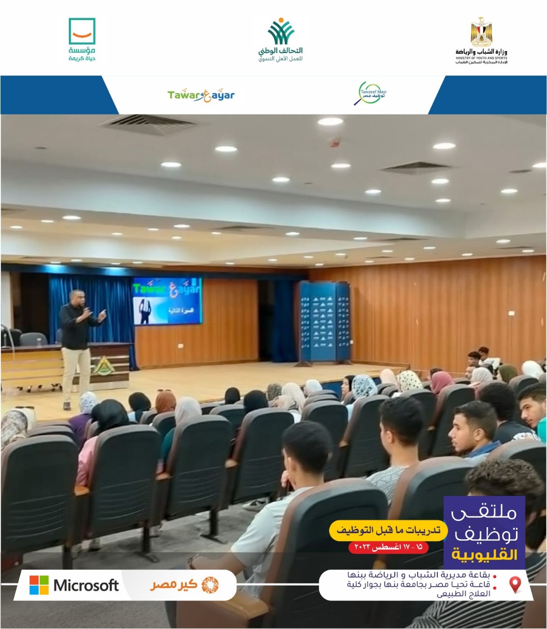 نفذت وزارة الشباب والرياضة من خلال الإدارة المركزية لتمكين الشباب تدريبات "طور وغير" (التدريب من أجل التوظيف)، خلال الفترة من (15- 17) أغسطس، على هامش ملتقيات التوظيف يومي (20، 21) أغسطس الجاري، بمحافظتي القليوبية والدقهلية، بالتعاون مع مؤسسة حياة كريمة.