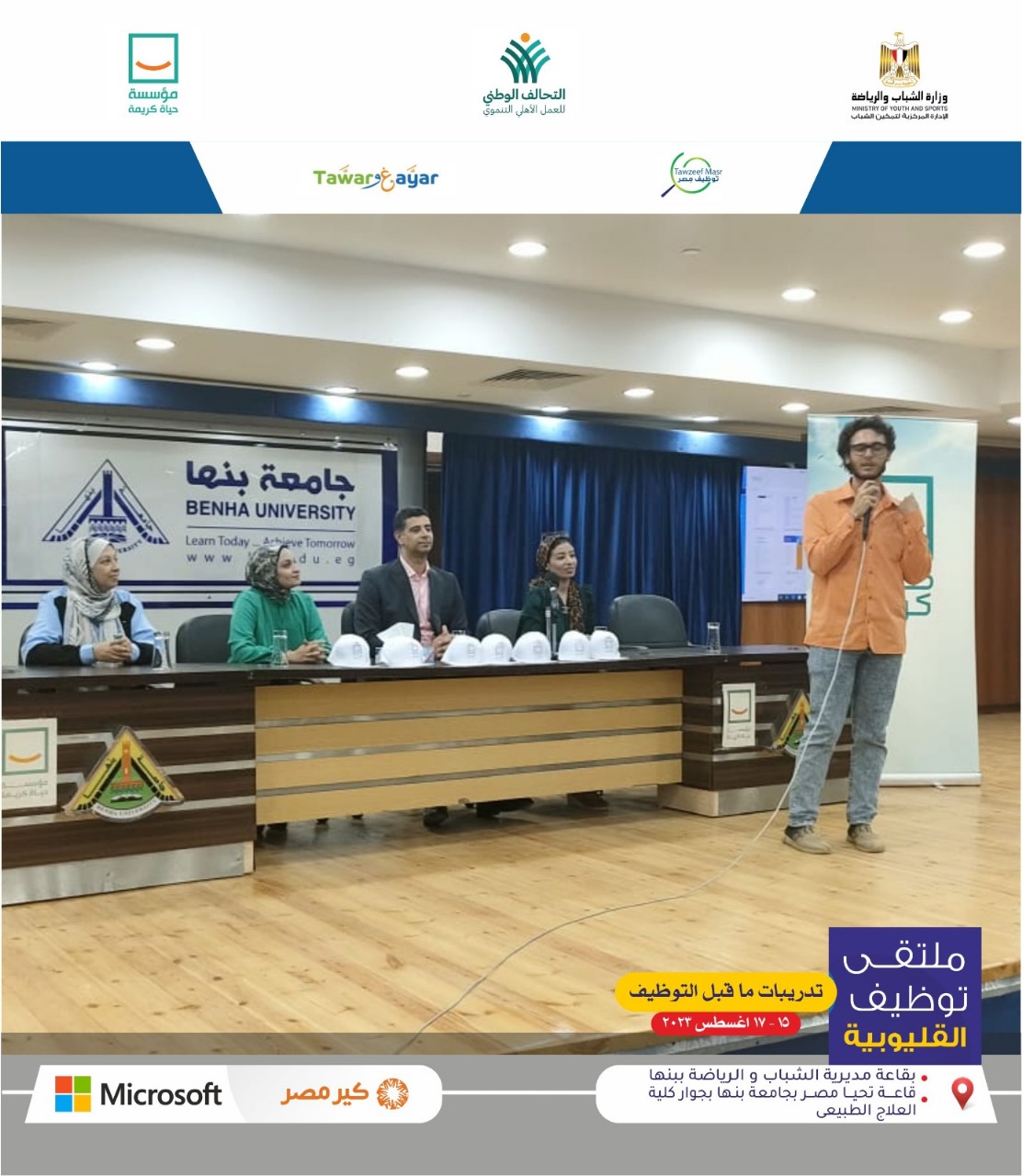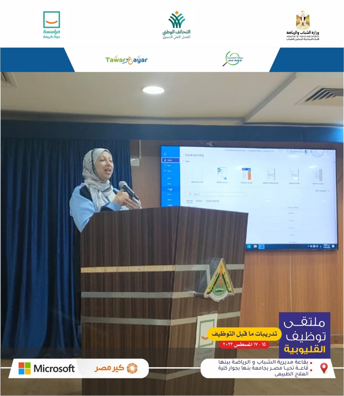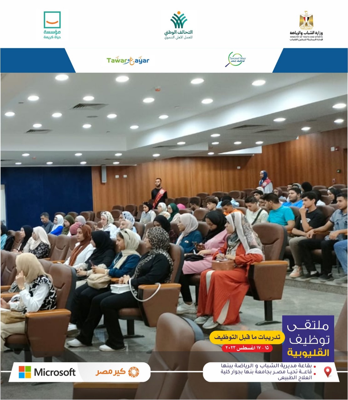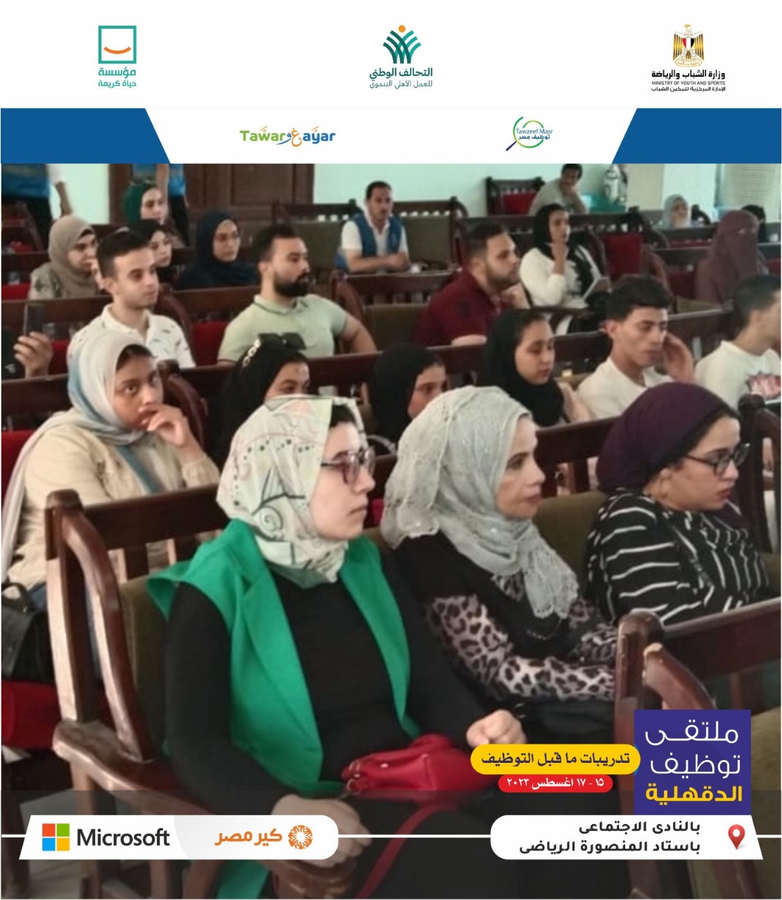نفذت وزارة الشباب والرياضة من خلال الإدارة المركزية لتمكين الشباب تدريبات "طور وغير" (التدريب من أجل التوظيف)، خلال الفترة من (15- 17) أغسطس، على هامش ملتقيات التوظيف يومي (20، 21) أغسطس الجاري، بمحافظتي القليوبية والدقهلية، بالتعاون مع مؤسسة حياة كريمة.