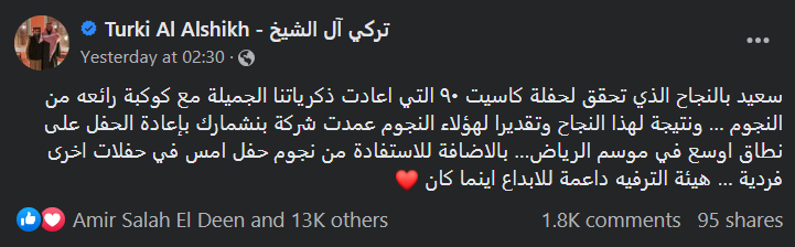 تركي آل الشيخ يُعلن عن إعادة حفل كاسيت 90 بموسم الرياض قريبًا: