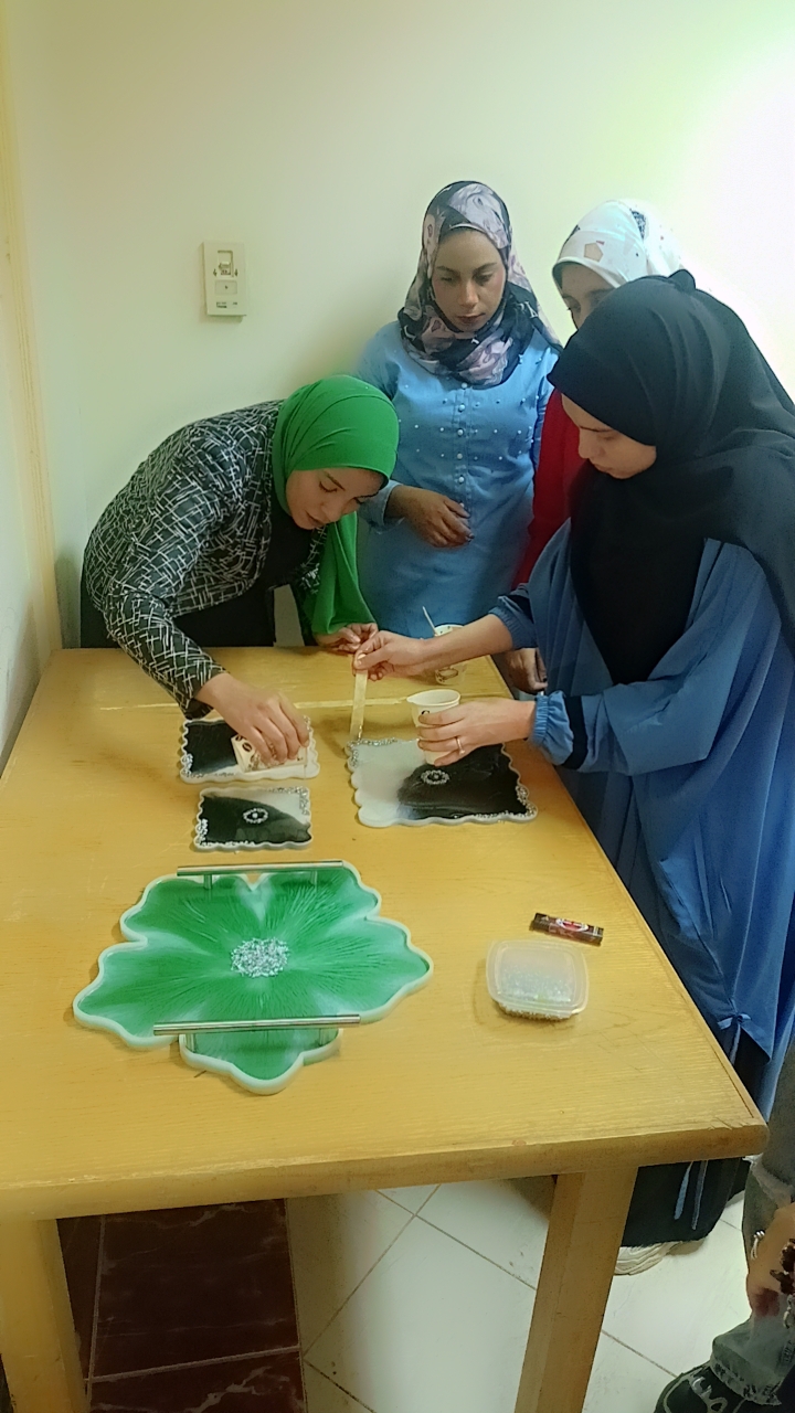 بمركز شباب الخارجه بمحافظة الوادي الجديد نفذت ورشة الريزن، وتم تدريب الفتيات ليتعرفن على مادة الريزن المستخدمة والإحتياطات المتبعة والأدوات المستخدمة وكيفية تشكيلها لظهور المنتج .