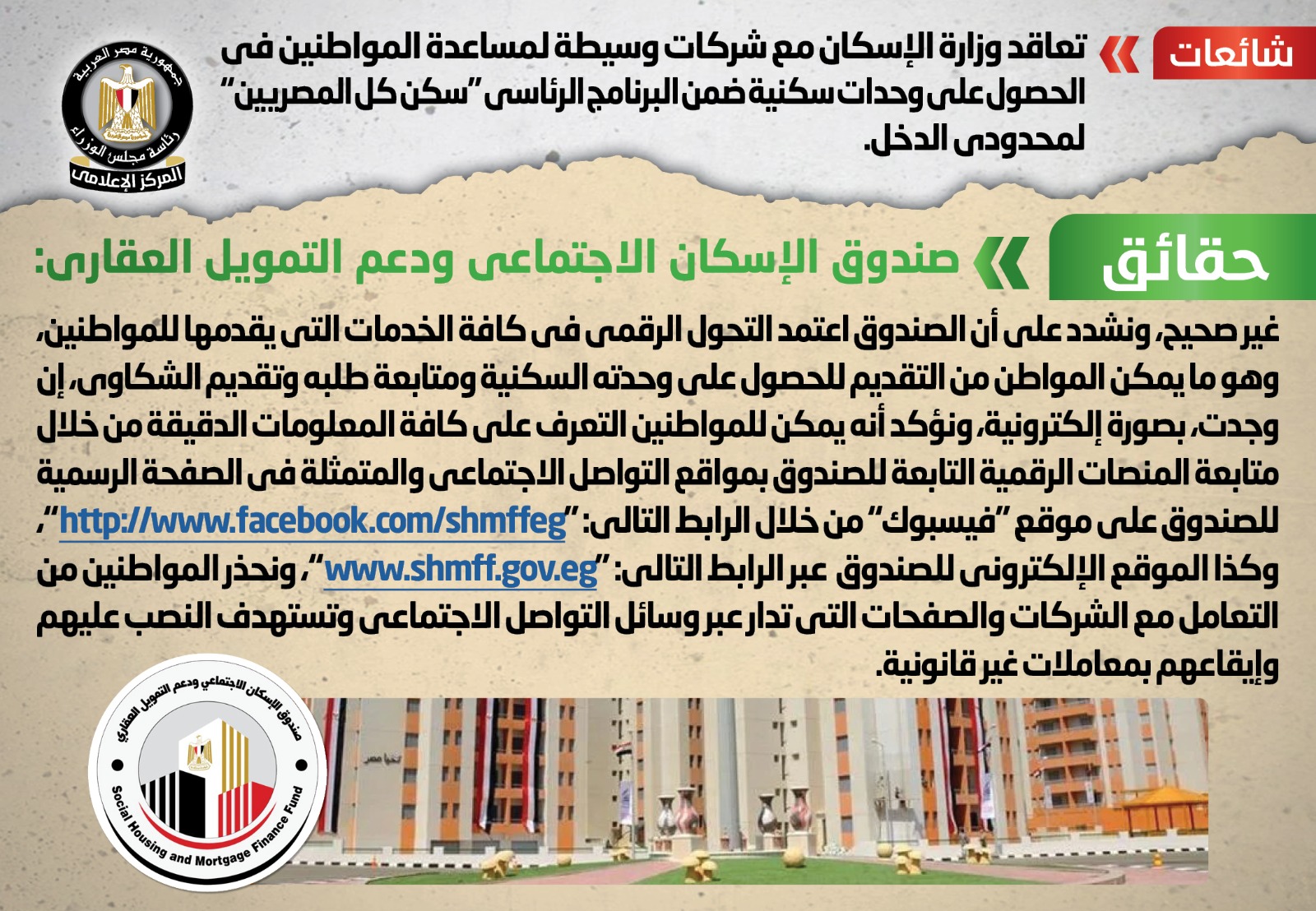 أعلن المركز الإعلامي لمجلس الوزراء، وصندوق الإسكان الاجتماعي ودعم التمويل العقاري، أنه لا صحة للتعاقد مع شركات وسيطة لمساعدة المواطنين في الحصول على وحدات سكنية ضمن البرنامج الرئاسي "سكن كل المصريين" لمحدودي الدخل، مشدداً على أن الصندوق اعتمد التحول الرقمي في كافة الخدمات التي يقدمها للمواطنين، وهو ما يمكن المواطن من التقديم للحصول على وحدته السكنية ومتابعة طلبه وتقديم الشكاوى، إن وجدت، بصورة إلكترونية، مؤكداً أنه يمكن للمواطنين التعرف على كافة المعلومات الدقيقة من خلال متابعة المنصات الرقمية التابعة للصندوق بمواقع التواصل الاجتماعي والمتمثلة في الصفحة الرسمية للصندوق على موقع "فيسبوك" من خلال الرابط التالي:"http://www.facebook.com/shmffeg"، وكذا الموقع الإلكتروني للصندوق عبر الرابط التالي: "www.shmff.gov.eg"، مُحذراً المواطنين من التعامل مع الشركات والصفحات التي تدار عبر وسائل التواصل الاجتماعي وتستهدف النصب عليهم وإيقاعهم بمعاملات غير قانونية.