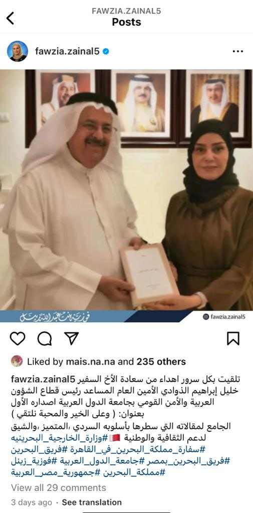 التقت السفيرة فوزية بنت عيد الله زينل سفيرة مملكة البحرين لدى جمهورية مصر العربية والمندوبة الدائمة لدى جامعة الدول العربية، السفير خليل إبراهيم الذوادي الأمين العام المساعد رئيس قطاع الشؤون العربية والأمن القومي بجامعة الدول العربية، حيث أهداها نسخة من كتابه: (على الخير والمحبة نلتقي). وأشادت السفيرة فوزية بنت عبدالله زينل بجهود وإسهامات السفير خليل الذوادي في المجال الدبلوماسي الإعلامي والصحفي والأدبي وما يتمتع به من خبرة طويلة في مجال العمل العربي المشترك.