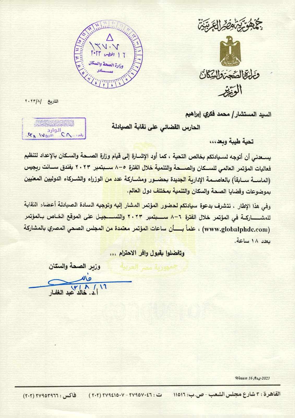 أعلنت النقابة العامة لصيادلة مصر، عن مشاركتها في فعاليات المؤتمر العالمى للسكان والصحة والتنمية والذى تنظمه وزارة الصحة والسكان خلال الفترة من ٦ إلى ٨ سبتمبر ٢٠٢٣ بفندق سانت ريجيس "الماسة سابقا" بالعاصمة الادارية الجديدة، بحضور ومشاركة عدد من الوزراء الشركاء الدوليين المعنيين بموضوعات وقضايا الصحة والسكان والتنمية بمختلف دول العالم.