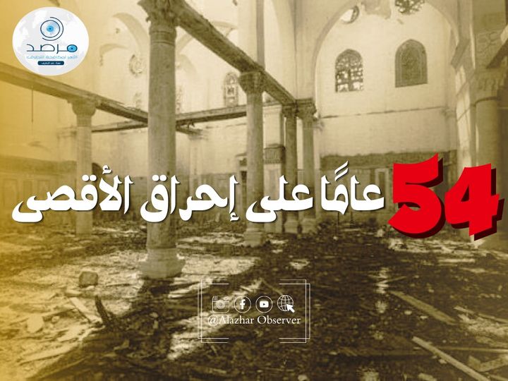 يمضي اليوم 54 عامًا على واحدة من أبشع الجرائم التي نفذها الاحتلال الصهيوني بحق أولى القبلتين، وثالث الحرمين، ومسرى رسولنا الأمين صلى الله عليه وسلم، المسجد الأقصى المبارك؛ بهدف تدمير وطمس أهم المعالم الإسلامية والتاريخية في مدينة القدس المحتلة، وهي جريمة إحراق المسجد الأقصى المبارك عمدًا.