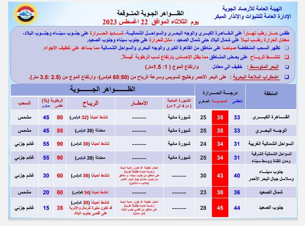كشفت الهيئة العامة للأرصاد الجوية غدًا الثلاثاء، حيث يسود طقس حار رطب نهارا على القاهرة الكبرى والوجه البحرى والسواحل الشمالية، شديد الحرارة على جنوب سيناء وجنوب الصعيد، معتدل الحرارة رطب ليلا على شمال البلاد حتى شمال الصعيد، مائل للحرارة على جنوب سيناء وجنوب الصعيد.