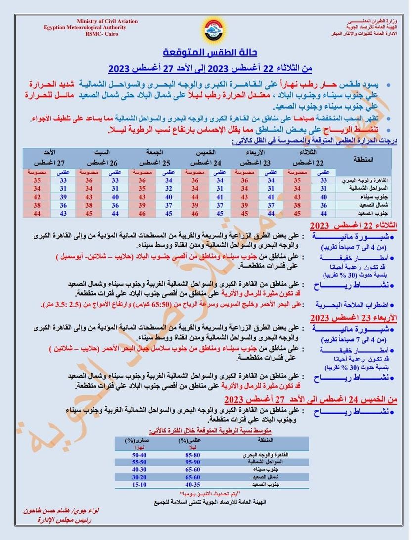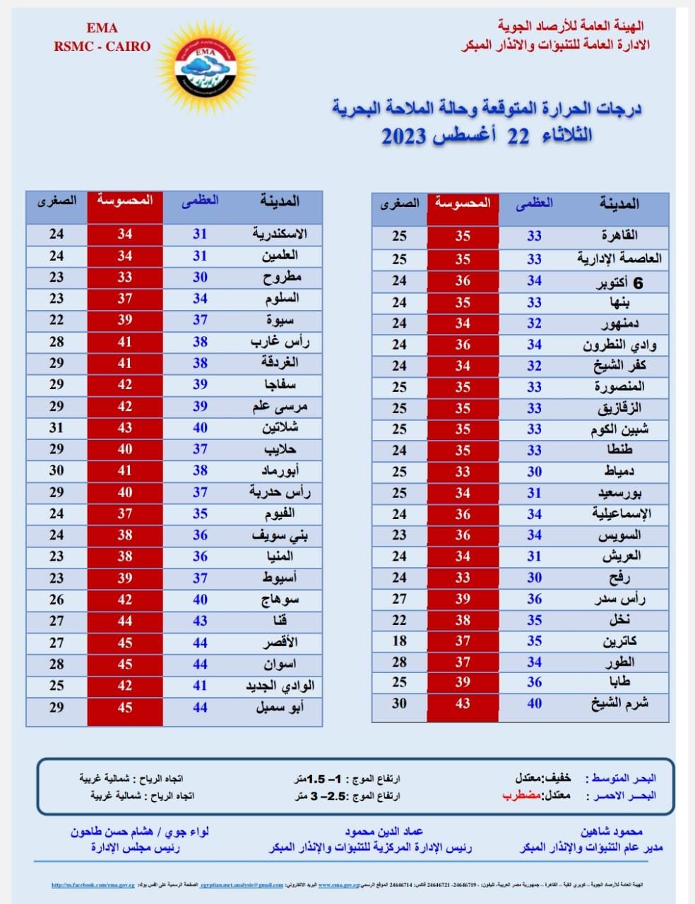 القاهرة العظمى 33  درجة والمحسوسة 35 درجة والصغرى 25 درجة.