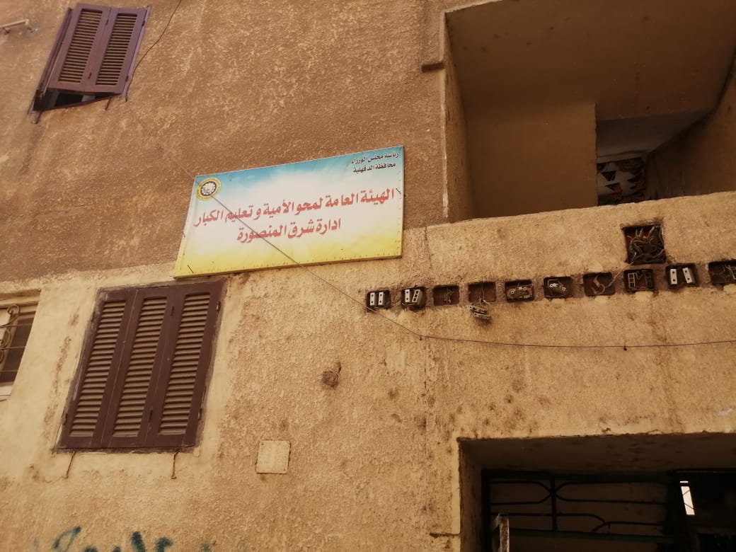 في منطقة جديلة بمدينة المنصورة يقع مبنى إدارة شرق المنصورة لمحو الأمية وتعليم الكبار أسفل احدى العمارات السكنية ، وحتى يصل المتردد على المبنى عليه أن يسلك السلم حتى يصل أسفل المبنى الضيق جدا ، وإذا توجه ونجح في الوصول إلى المبنى يفاجئ بأنه يقع في مساحة ضيقة للغاية حوالي "غرفتين صغيرتين" وتم " حشر " مكاتب الموظفين بصعوبة بالغة في المبنى ، وإذا تردد عدد من الأشخاص لا يتجاوز أصابع اليد الواحدة على المبنى يكاد من الصعب بل من المستحيل التعامل معهم نتيجة ضيق المكان ، ويضطروا للدخول فردا وراء الأخر .