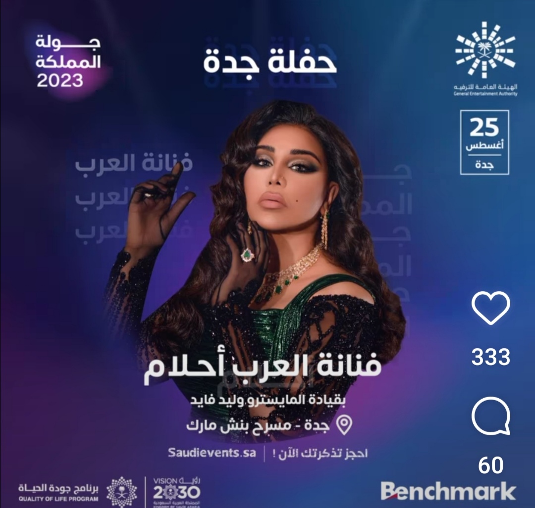 تلتقي الفنانة أحلام من جديد في ليلة غنائية مع جمهور السعودية، ضمن فعاليات جولة المملكة التي تضم عددًا كبيرًا من نجوم الغناء العربي والخليجي.