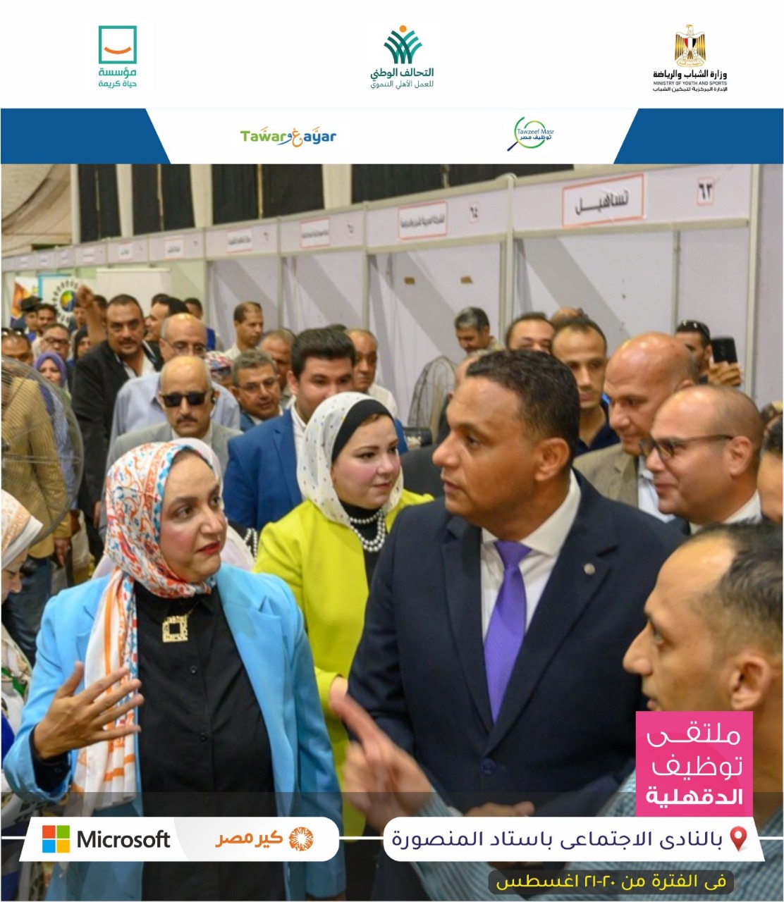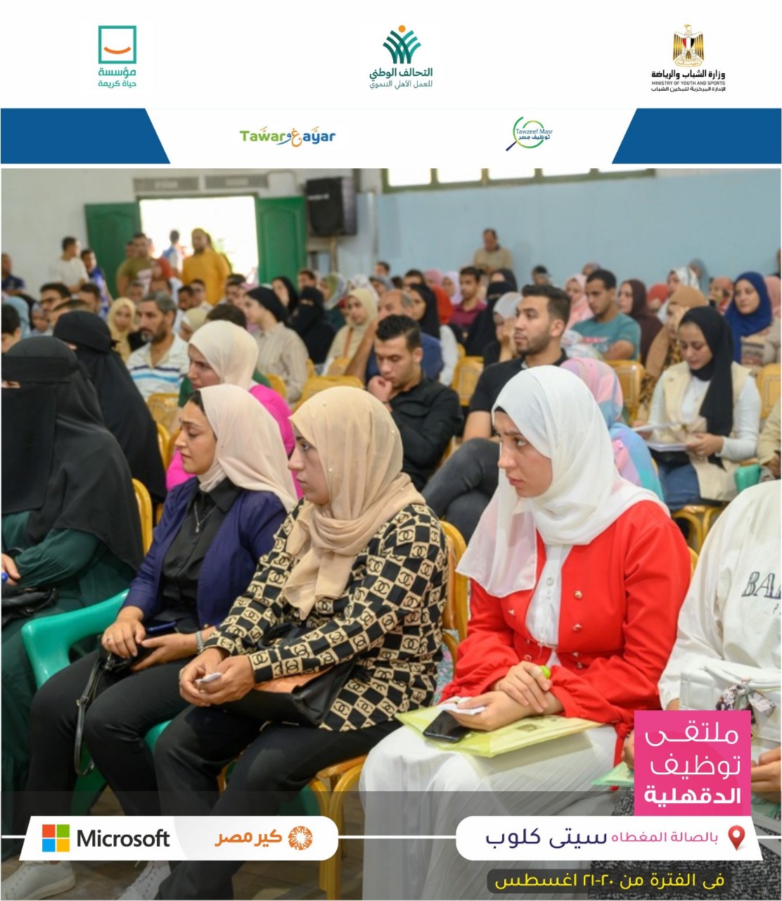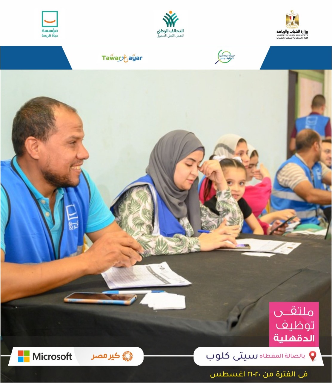 نفذت وزارة الشباب والرياضة من خلال الإدارة المركزية لتمكين الشباب (الإدارة العامة للمبادرات الشبابية)، ومؤسسة حياة كريمة ملتقيات "توظيف مصر " بالدقهلية والقليوبية من خلال مبادرة "توظيف مصر "، بالتعاون مع مؤسسة كير مصر وشركة مايكروسوفت، ضمن فعاليات صيف شبابنا لتأهيل الشباب لسوق العمل، والتشبيك مع الوظائف من خلال منصة توظيف مصر، بمشاركة قرابة ٨ الالف شاب وفتاة.