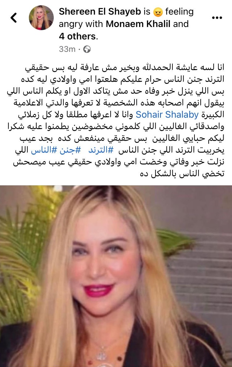 وأردفت شيرين الشايب: "اللي ينزل خبر وفاه حد مش يتاكد الأول أو يكلم الناس اللي بيقول انهم أصحابه هذه الشخصية لا تعرفها والدتي الاعلامية الكبيرة Sohair Shalaby وانا لا اعرفها مطلقًا ولا كل زملائي وأصدقائي الغاليين اللي كلموني مخضوضين يطمنوا عليه شكرا ليكم حبايبي الغاليين".