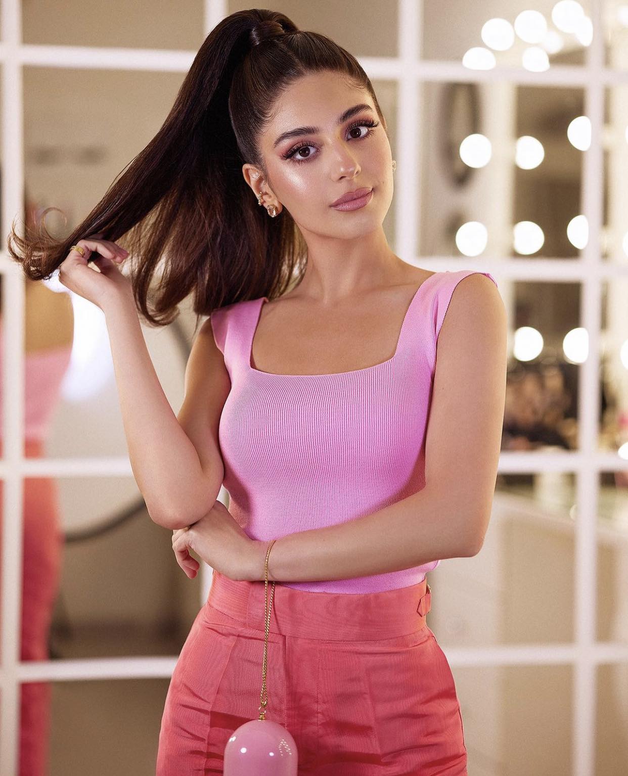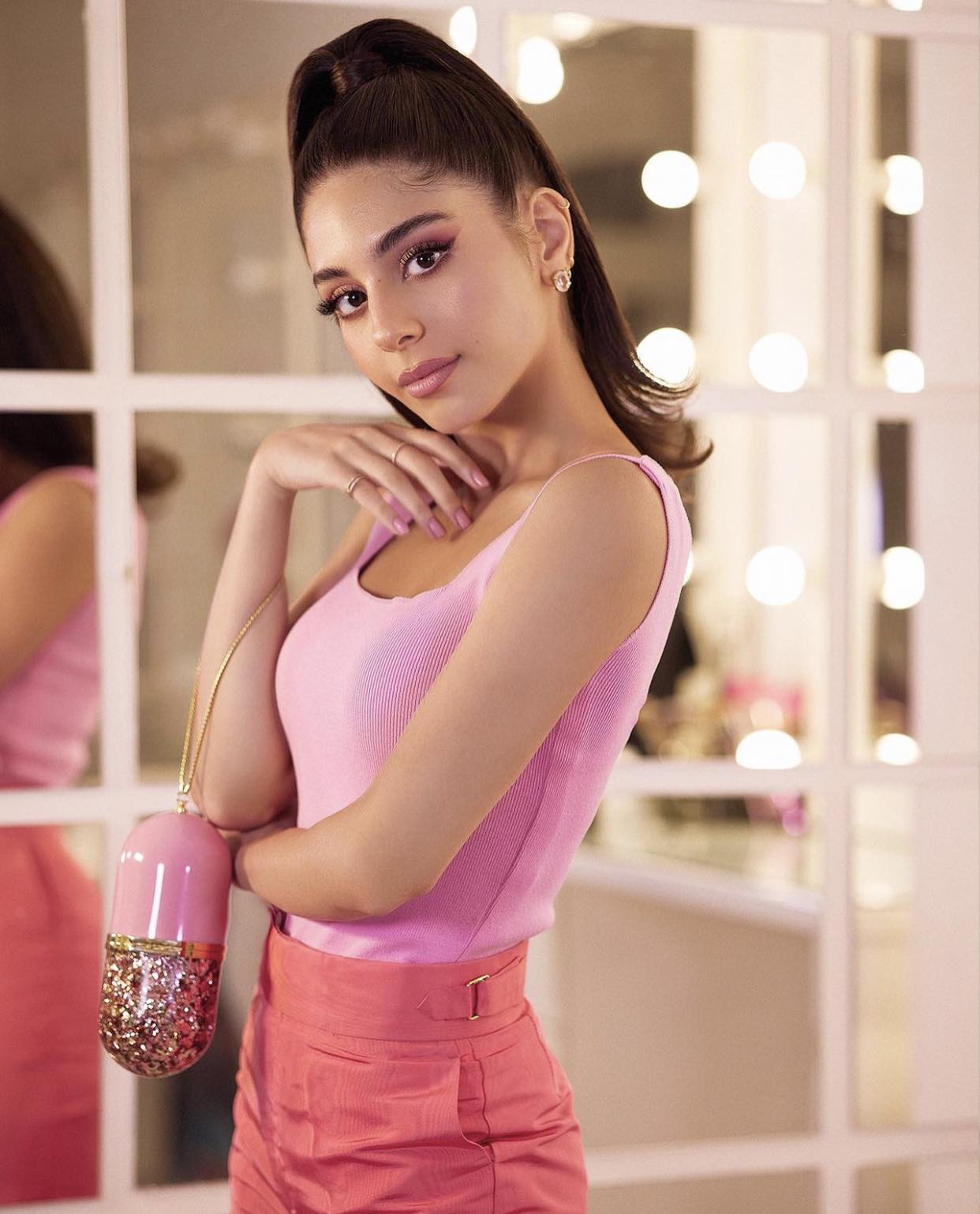 وبدت مايان السيد بإطلالة باللون الوردي، فإرتدت بنطال بصيحة الهايويست، ونسقت عليه توب مُجسم مكشوف، مما أبرز رشاقتها ونحافة خصرها.