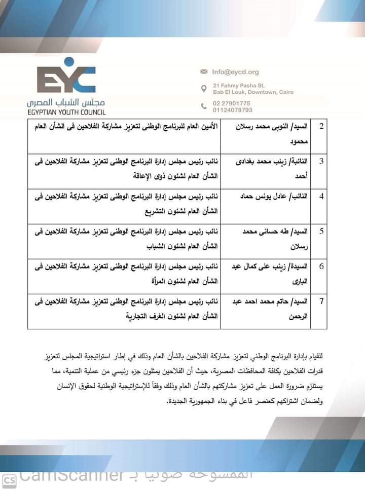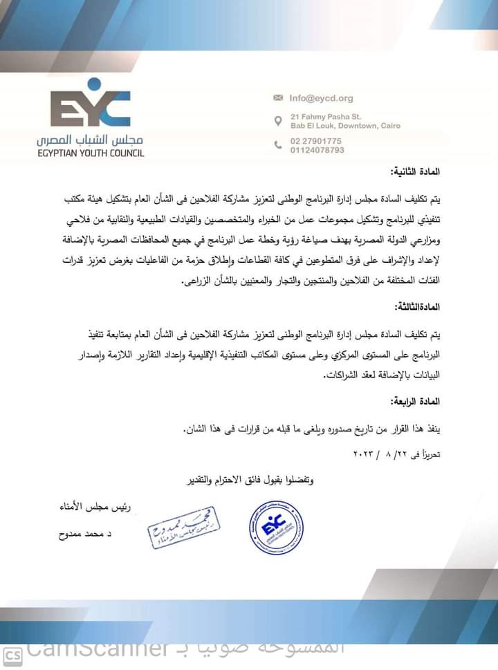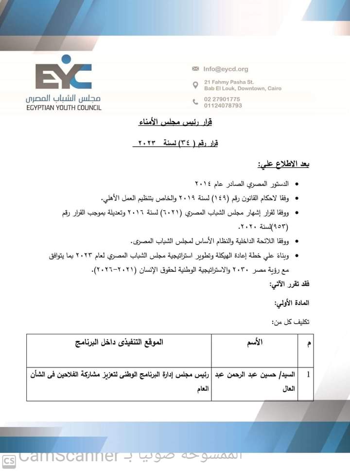 وأوضح قرار مجلس الأمناء رقم 34 لسنة 2023، أنه بعد الاطلاع على الدستور المصري الصادر عام 2014، ووفقا لأحكام القانون رقم 149 لسنة 2019 والخاص بتنظيم العمل الأهلي، ووفقا لقرار إشهار مجلس الشباب المصري "6021" لسنة 2016 وتعديله بموجب القرار رقم 953 لسنة 2020، وكذلك وفقًا للائحة الداخلية والنظام الأساس لمجلس الشباب المصري، وبناء علي خطة إعادة الهيكلة وتطوير استراتيجية مجلس الشباب المصري لعام 2023، بما يتوافق مع رؤية مصر 2030 والاستراتيجية الوطنية لحقوق الإنسان 2012 / 2026، فقد تقرر تكليف كلا من حسين عبدالرحمن عبدالعال وشهرته حسين أبوصدام،رئيسا لمجلس إدارة البرنامج الوطني لتعزيز مشاركة الفلاحين في الشأن العام ، والنوبي محمد رسلان وشهرته النوبي أبواللوز، الأمين العام للبرنامج الوطني لتعزيز مشاركة الفلاحين فى الشأن العام،والنائبة زينب محمد بغدادي نائبا لرئيس مجلس الإدارة لشئون الإعاقة،والنائب عادل يونس حماد نائبا لرئيس مجلس الإدارة لشئون التشريع،وطه حساني محمد رسلان نائبا لرئيس مجلس الإدارة لشئون الشباب،وزينب علي كمال عبدالباري نائبا لرئيس مجلس الإدارة لشئون المرأة،وحاتم محمد أحمد عبدالرحمن نائبا لرئيس مجلس الإدارة لشئون الغرف التجارية.