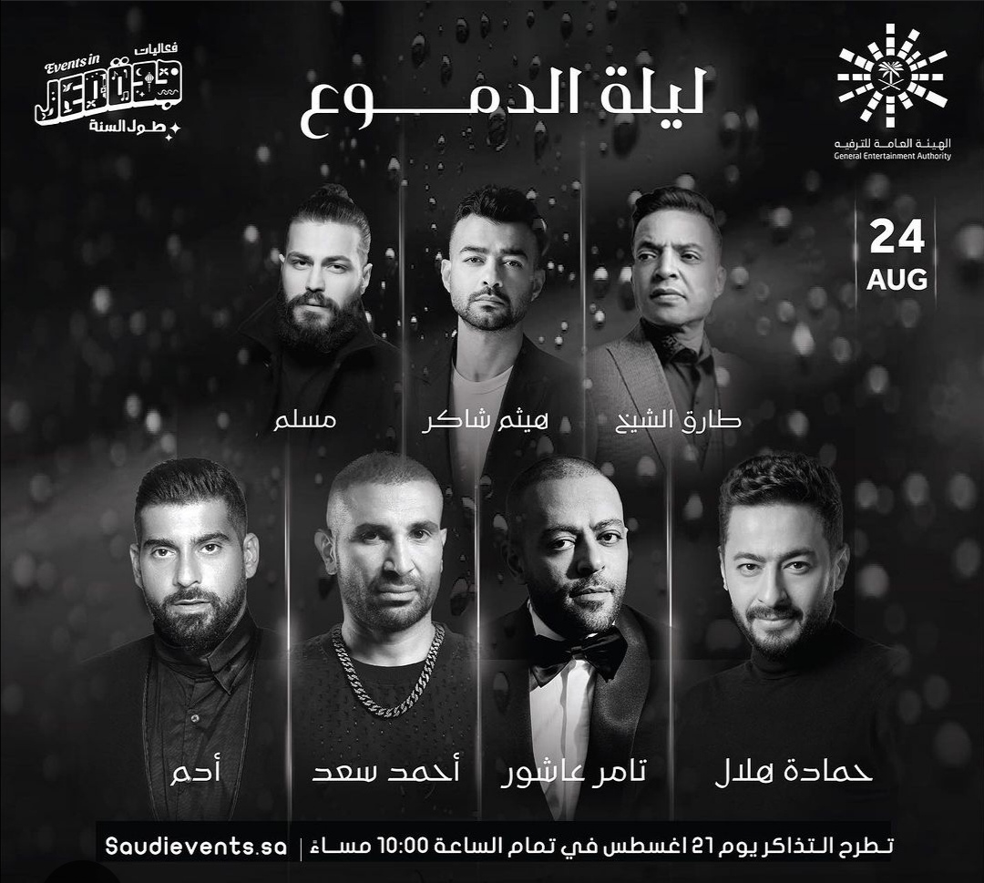يجتمع نجوم أبرز الأغاني المصرية الحزينة في السعودية، في ليلة عنوانها “ليلة الدموع”، وذلك ضمن فعاليات جدة التي تجمع نجوم الغناء العربي والخليجي.