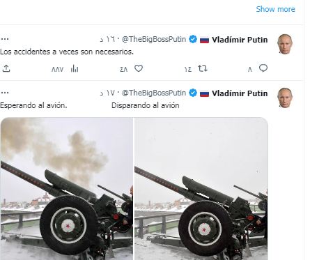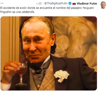 وغرد بوتين ساخرًا من موت يفجيني :" حادثة الطيران التي صادفت اسم الراكب يفغيني بريجوزين هي كارثة" ونشر صورة له وهو يشرب الخمر ويرفع كأسه.