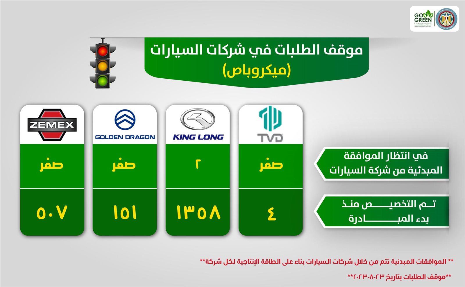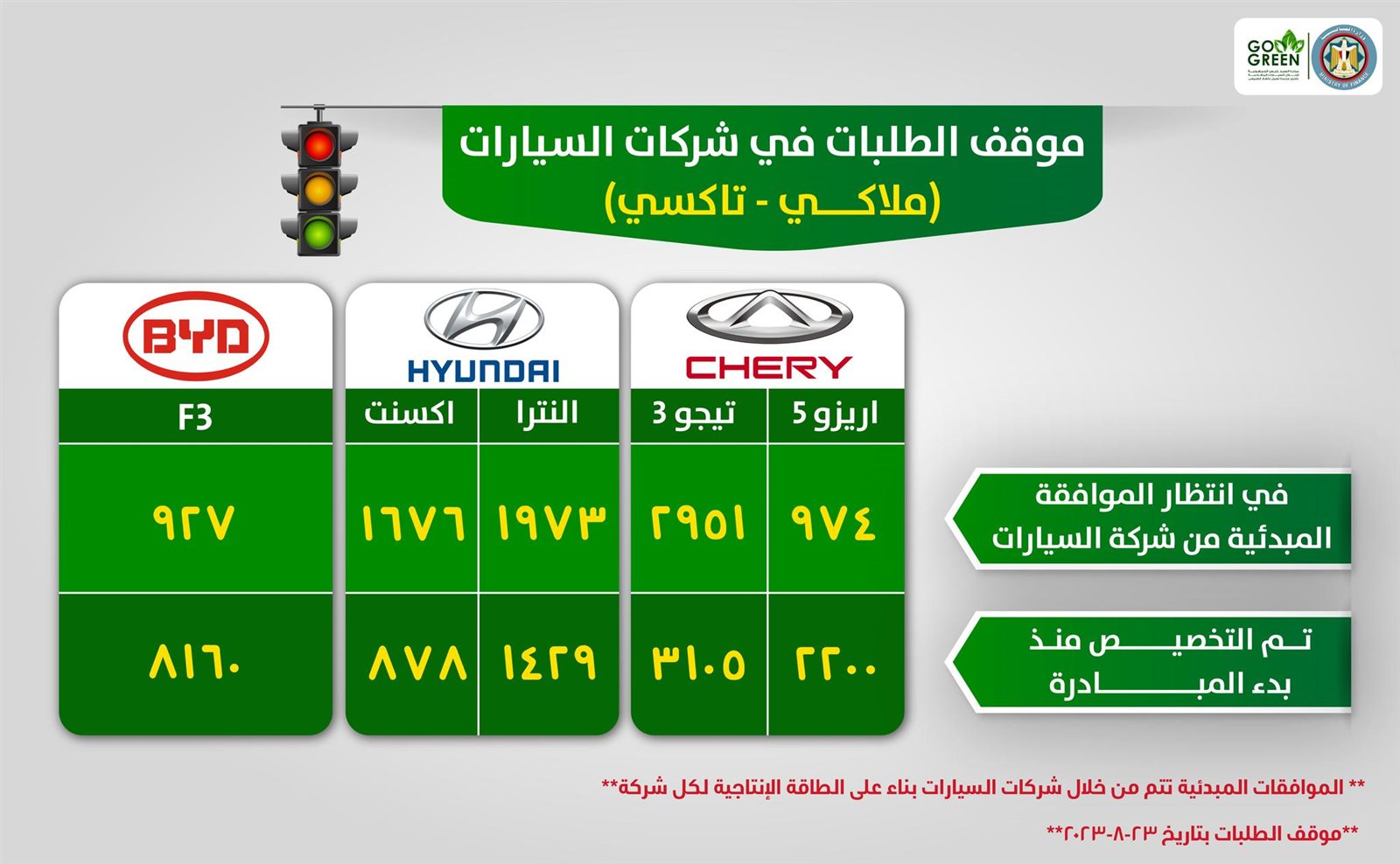 وقامت مبادرة إحلال السيارات بإعداد القائمة التالية التي توضح عدد الطلبات التي تنتظر الموافقة المبدئية من شركات السيارات لجميع الموديلات الموجودة داخل مبادرة إحلال السيارات المتقادمة، وكذلك التي تم تخصيصها منذ بداية مبادرة إحلال السيارات "الملاكي- التاكسي- الميكروباص":