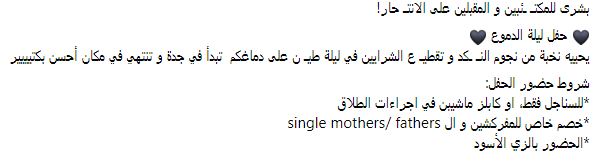وكتب آخر منشور على موقع التواصل الإجتماعي "فيس بوك":" بشرى للمكتئبين و المقبلين على الانتحار )حفل ليلة الدموع) يحييه نخبة من نجوم النكد و تقطيع الشرايين في ليلة طين على دماغكم تبدأ في جدة و تنتهي في مكان أحسن بكتيييير، شروط حضور الحفل، للسناجل فقط او كابلز ماشيبن في اجراءات الطلاق، خصم خاص للمفركشين، الحضور بالزي الأسود ".