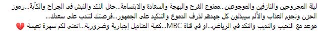 وسخر آخر من الحفل، وعلق، قائلًا:" ليلة المجروحين والنازفين والموجوعين، ممنوع الفرح والبهجة والسعادة والابتسامة، حفل النكد والنبش في الجراح والكآبة، رموز الحزن ونجوم العذاب والألم سيبذلون كل جهدهم لذرف الدموع والتنكيد على الجمهور، فرصتك لتندب على سعدك، موعد مع النحيب والنديب والنكد في الرياض...او في قناة MBC...كمية المناديل إجبارية وضرورية...اتمنى لكم سهرة تعيسة ".