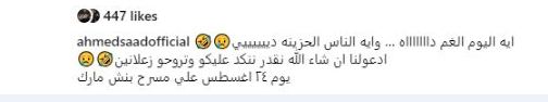 وعلق أحمد سعد، قائلًا:" إيه اليوم الغم ده، وإيه الناس الحزينة دي، ادعولنا إن شاء الله نقدر ننكد عليكو وتروحوا زعلانين، يوم 24 أغسطس على مسرح بنش مارك ".