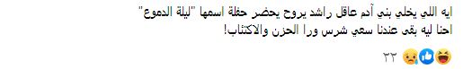 وانتقد واحدًا من الجمهور، المقبلين على حضور الحفل، وكتب:" ايه اللي يخلي بني آدم عاقل راشد يروح يحضر حفلة اسمها "ليلة الدموع"، احنا ليه بقى عندنا سعي شرس ورا الحزن والاكتئاب ".