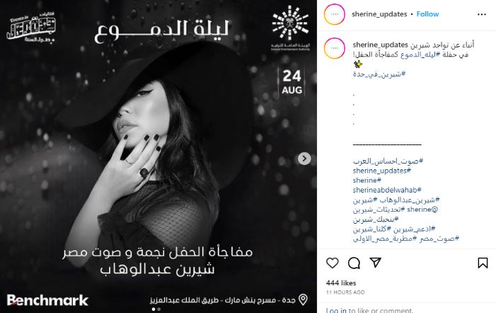 تداول رواد مواقع السوشيال ميديا، خصوصًا إنستجرام، أخبار وبوسترات تفيد بمشاركة الفنانة شيرين عبدالوهاب في حفل ليلة الدموع، والتي ستقام اليوم في المملكة العربية السعودية، كما انتشرت مجموعة من الصور عبر موقع "إكس" تويتر سابقًا، أثناء استقبال الفنانة في المطار بالورود، قائلين: أحدث ظهور لصوت مصر الأول شيرين قبل حفلها الليلة بجدة، وصول صوت مصر شيرين إلى جدة.