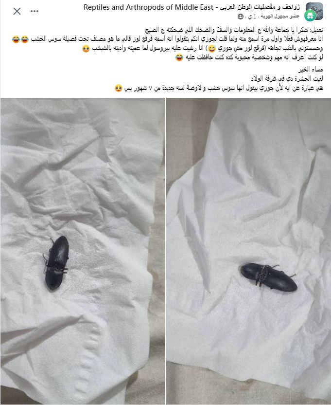 وقالت السيدة في المنشور: "مساء الخير لقيت الحشرة دي في غرفة الأولاد، هي عبارة عن أي لأن جوزي بيقول إنها سوسة الخشب، والأوضة لسة جديدة من 7 شهور".
